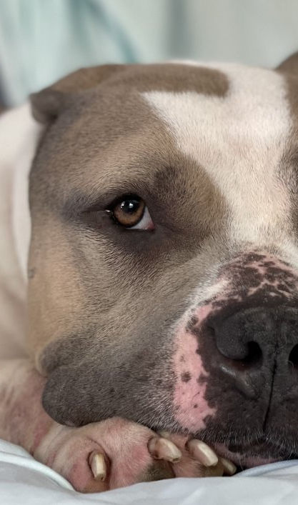 2022 post: Destiny has blossom into a goddess of beauty under our care. Wow; this dog is strikingly gorgeous! Her previous owners claimed that she was a papered American Bully. We don't know if this is true or not but she sure is a stunner. She is a big, stocky girl with a muscular build and well-proportioned conformation. Her blue fawn, tan, and white coat has regained its shine back and she has the cutest snoot freckles. Her ears were cropped and one of them refuses to stand up, which totally adds to her charm and gives her the most unique appearance.