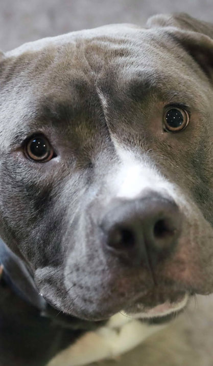 Max is on the larger side for Pit Bull dogs. He is taller in height with the classic, big Pit Bull block head. Max has a beautiful blue-steel coat with white spots on his chest and nose. While he is larger in size, he was blessed with the most puppy dog eyes that he uses to entice our volunteers into giving him lots of loving and treats.