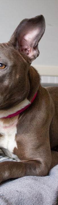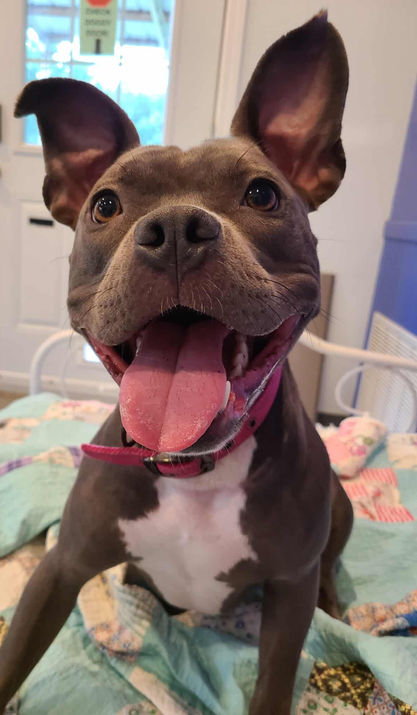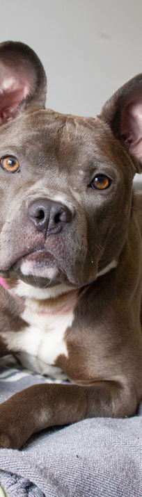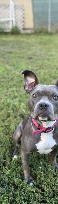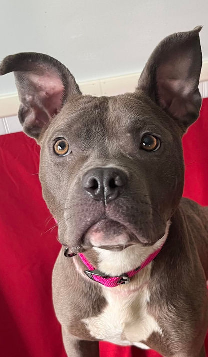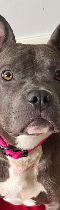 Pint size powerhouse!! Peeps is like a shrunken full grown Pit Bull! She has a strong athletic body with well muscled legs with great conformation. Peeps, aptly named after the Peeps Bunnies, with her adorable and expressive face with those big round eyes and dare we forget the magnificent specimens of tall and wide radio signal like ears with the perfect little ear tip flips make her look like the cutest bunny treat you ever did see! Her gorgeous thick blue/grey coat with her little white toe tips that of course enhance her tippy tap toe dances she does when excited just rounds out how precious she is!
